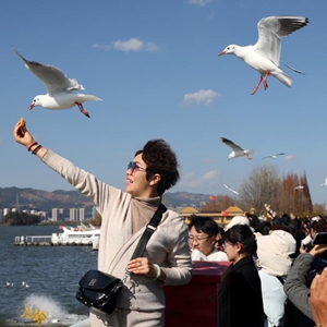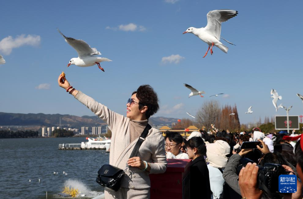 1月7日,云南省昆明市西山区海埂大坝,游客在拍摄海鸥。