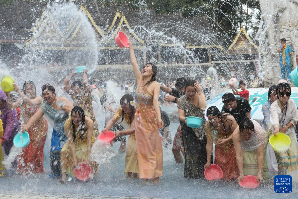 1月7日,游客在云南省景洪市傣族园景区参加泼水活动。
