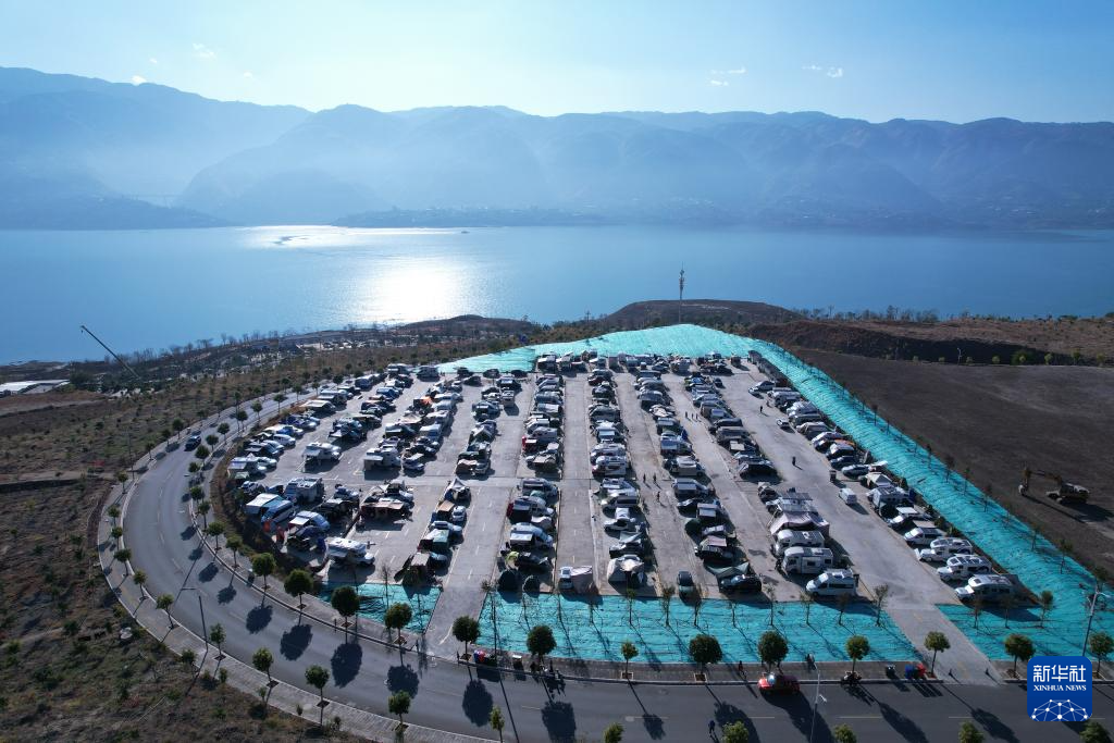 1月7日,位于金沙江边的云南省昭通市巧家县魁阁公园房车露营地,停满了来自全国各地的房车(无人机照片)。