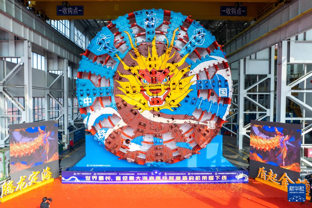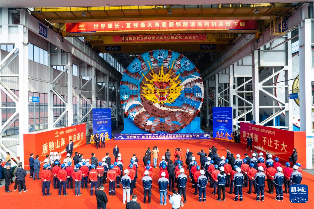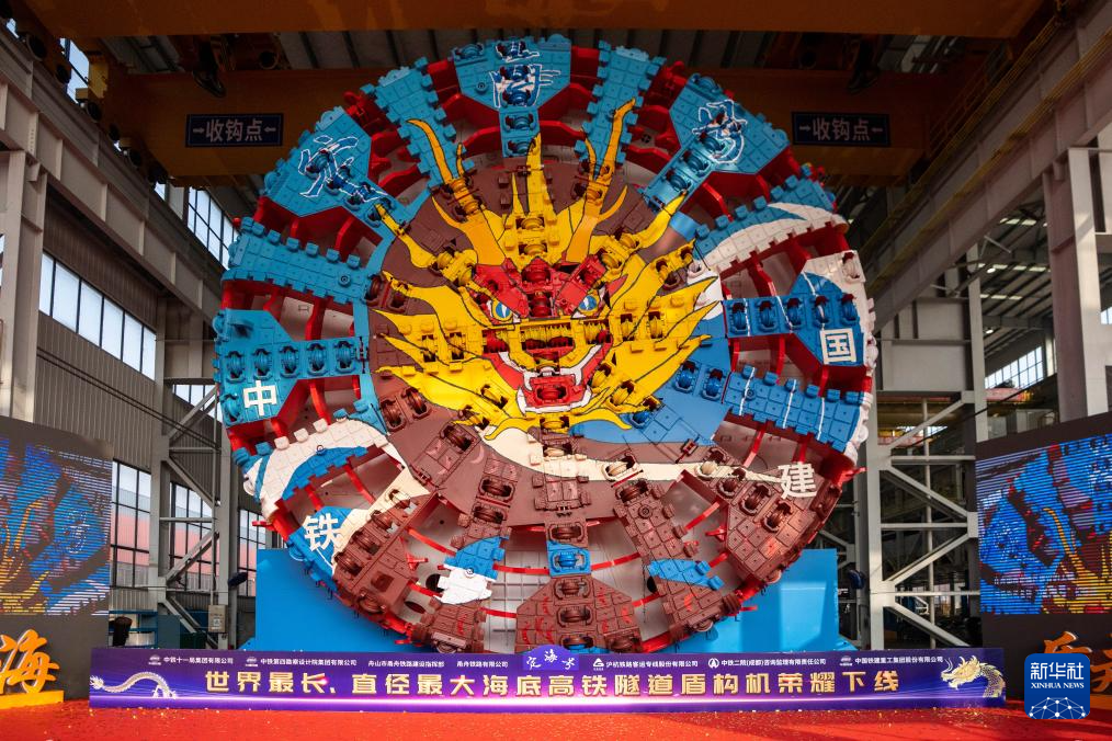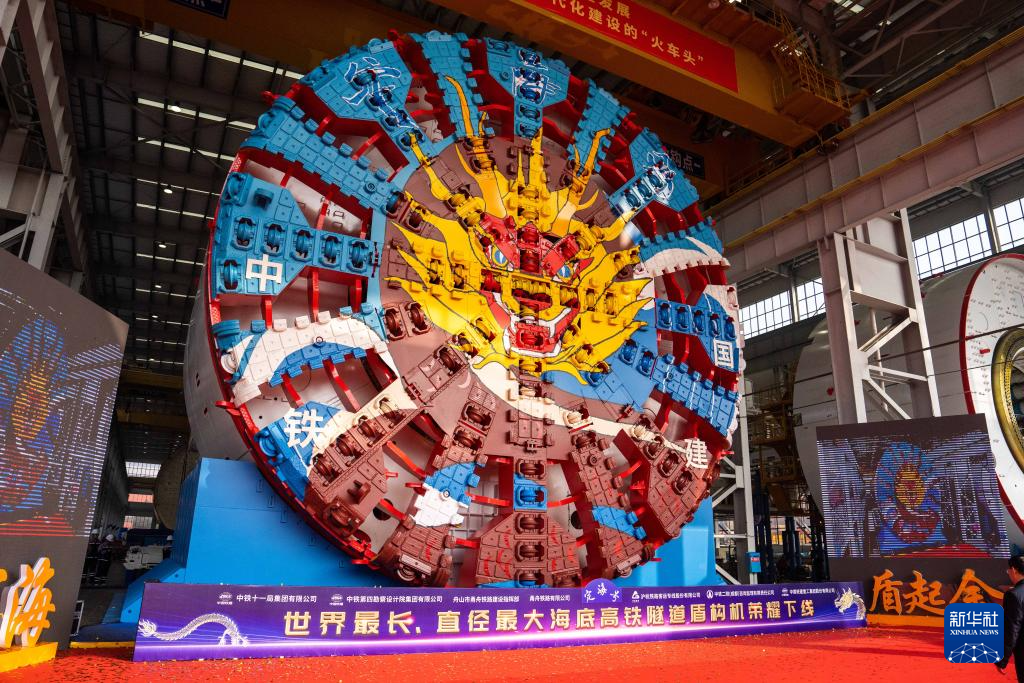 当日,由中铁十一局和铁建重工联合打造的超大直径盾构机“定海号”在长沙顺利下线,其最大开挖直径14.57米,总重量达4350吨,将投用于世界最长的海底高铁隧道——甬舟铁路金塘海底隧道建设。