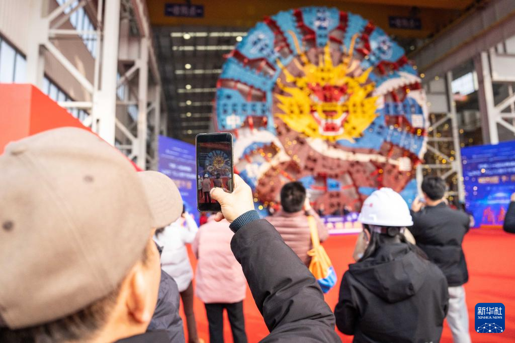 1月10日,在铁建重工长沙第一产业园,工人在下线仪式上拍摄“定海号”超大直径盾构机。