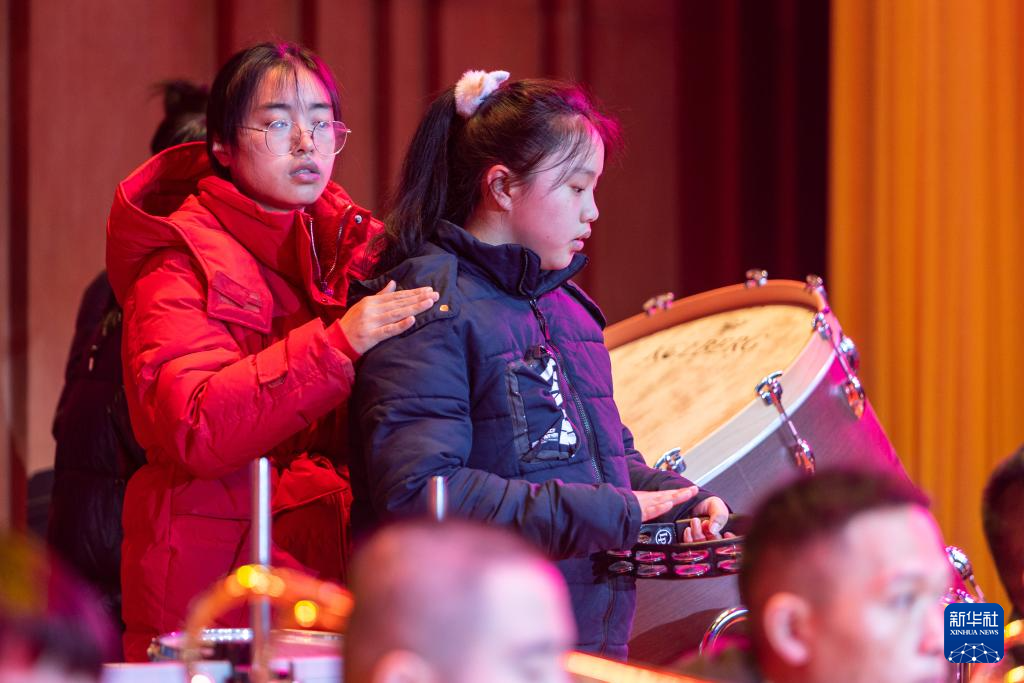 2024年1月6日,在重庆市特殊教育中心的扬帆音乐厅,扬帆管乐团成员(右)在彩排新年音乐会节目,老师通过拍打肩膀向她传递指挥的手势。
