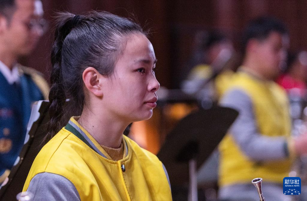 1月6日,在重庆市特殊教育中心的扬帆音乐厅,扬帆管乐团成员蒋小花在听合唱《蜗牛》时落泪。