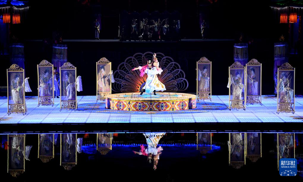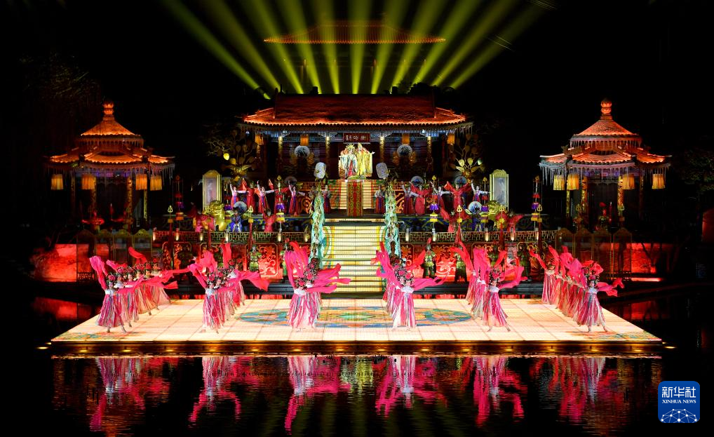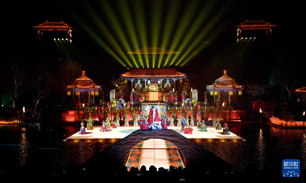 冬日寒夜,骊山脚下灯火璀璨,位于西安市临潼区的华清宫九龙湖上,根据白居易长篇叙事诗《长恨歌》创作的同名大型实景历史舞剧每晚在此上演。以山为大幕,水为舞台,70分钟的舞剧将历史故事、舞台演艺和声光电巧妙融合,艺术再现了1300多年前华清宫里唐玄宗与杨玉环的爱情故事,展示了大唐盛世的恢弘气象。