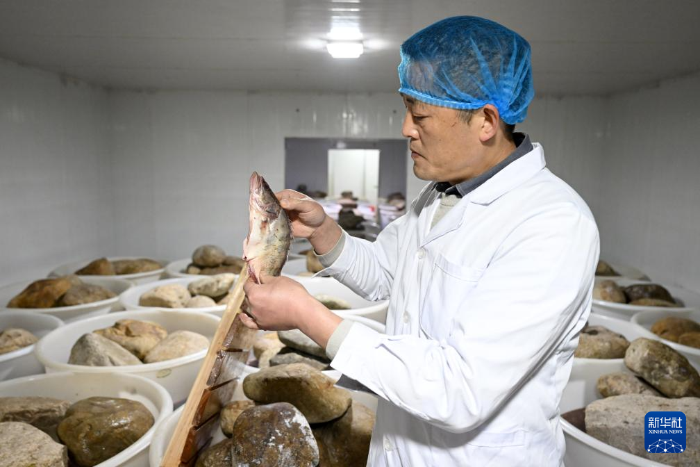 1月11日,在黄山市休宁县的黄山市徽康食品有限公司内,徽州臭鳜鱼制作技艺非遗传承人韩可军在查看鳜鱼的腌制情况。