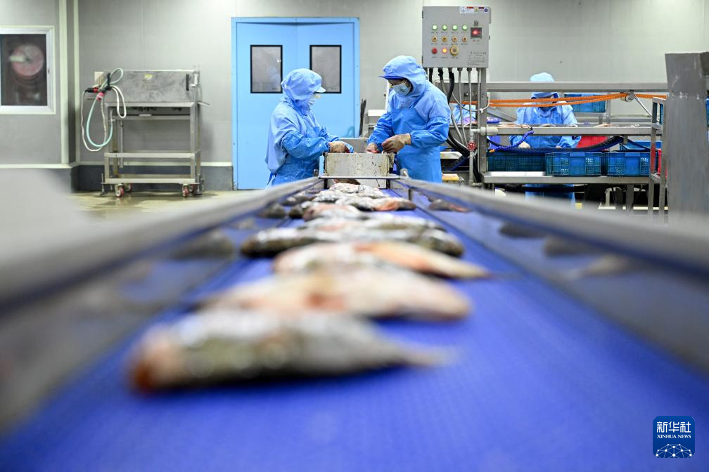 1月11日,在黄山市休宁县的黄山皖新徽三食品供应链有限公司内,工人在生产线上加工制作臭鳜鱼。