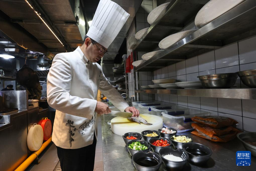 1月11日,在黄山市一家徽菜馆,徽州臭鳜鱼制作技艺非遗传承人吴永学在烹饪臭鳜鱼。