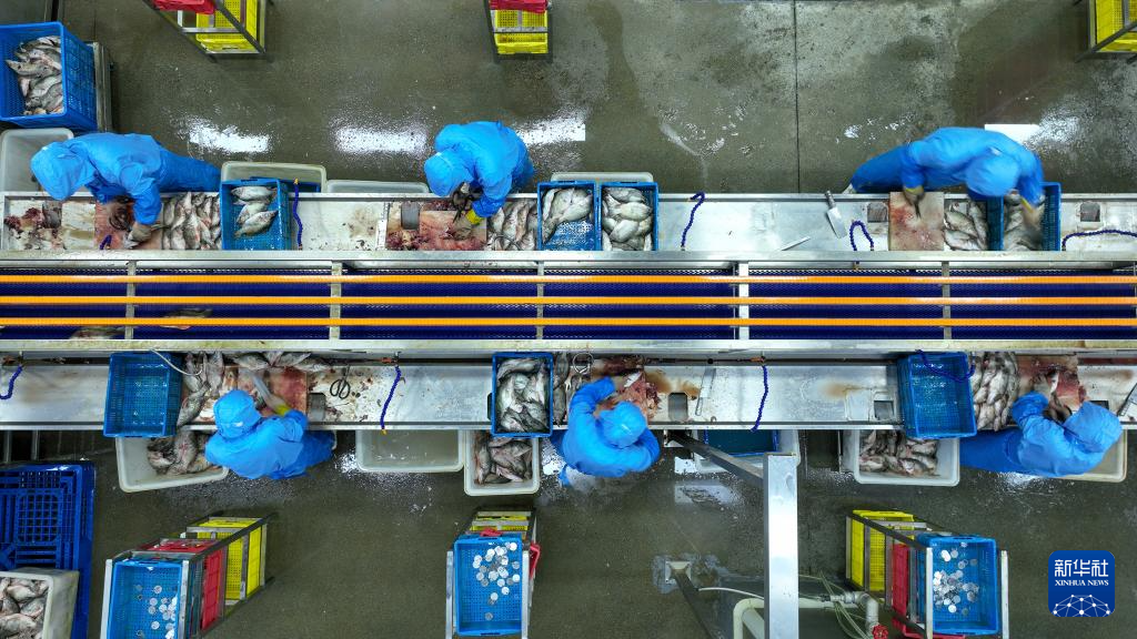 1月11日,在黄山市休宁县的黄山皖新徽三食品供应链有限公司内,工人在生产线上加工制作臭鳜鱼(无人机照片)。