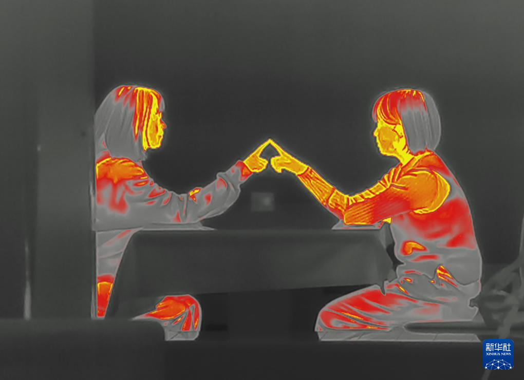2023年12月24日,在全黑的环境中,就餐者尝试接触手指(热成像摄影)。