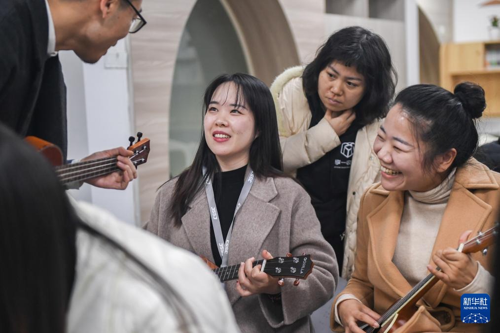 在众人的鼓掌声中,尤克里里课程教师汪阔林略显羞涩,拨动琴弦,弹唱起本节课要教授的曲目《新年好》。