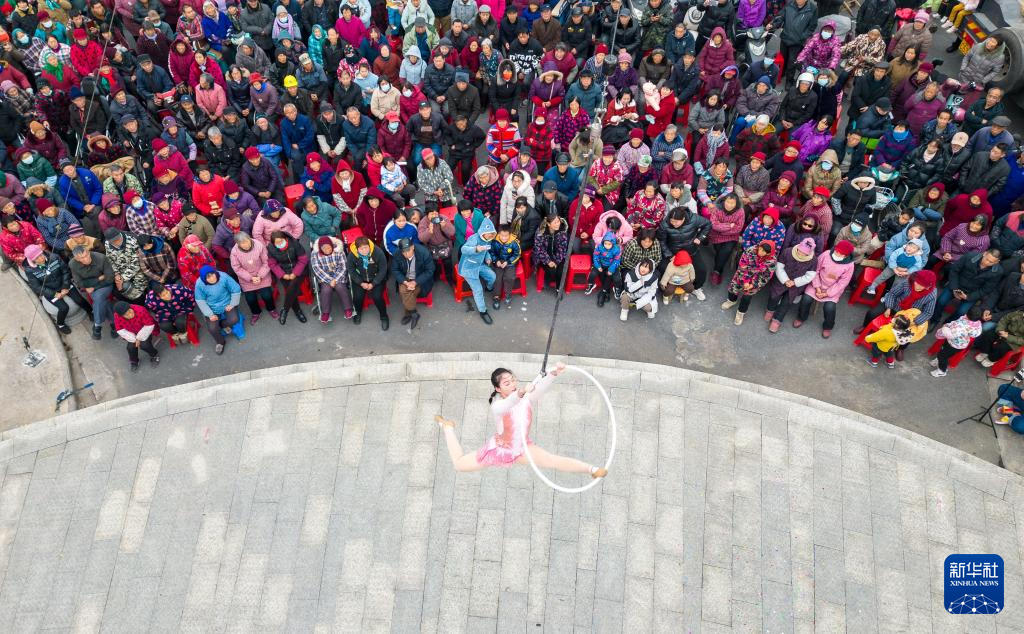 1月14日,在江苏省海安市雅周镇兴雅社区百姓广场上,文化志愿者在表演杂技节目(无人机照片)。