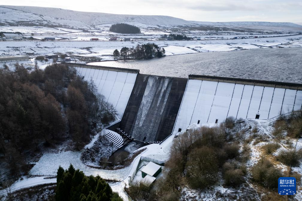 这是1月19日在英国英格兰北部西约克郡拍摄的一处水库的雪后景色(无人机照片)。