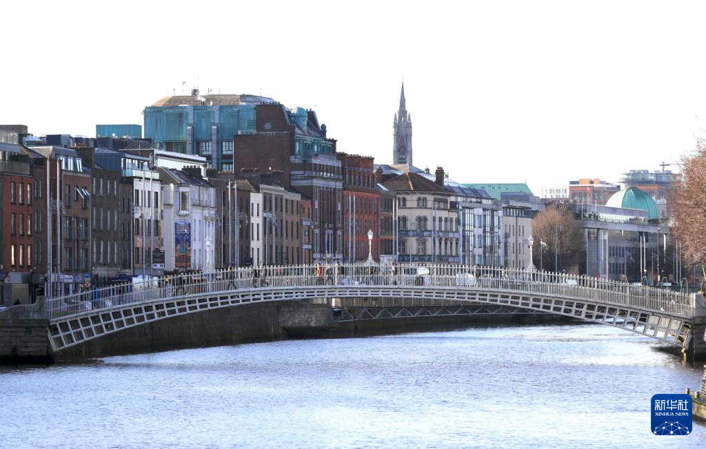 这是1月15日在爱尔兰首都都柏林拍摄的半便士桥,半便士桥是都柏林的一处著名地标,横跨利菲河。
