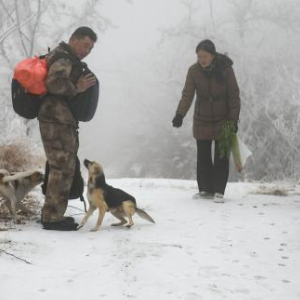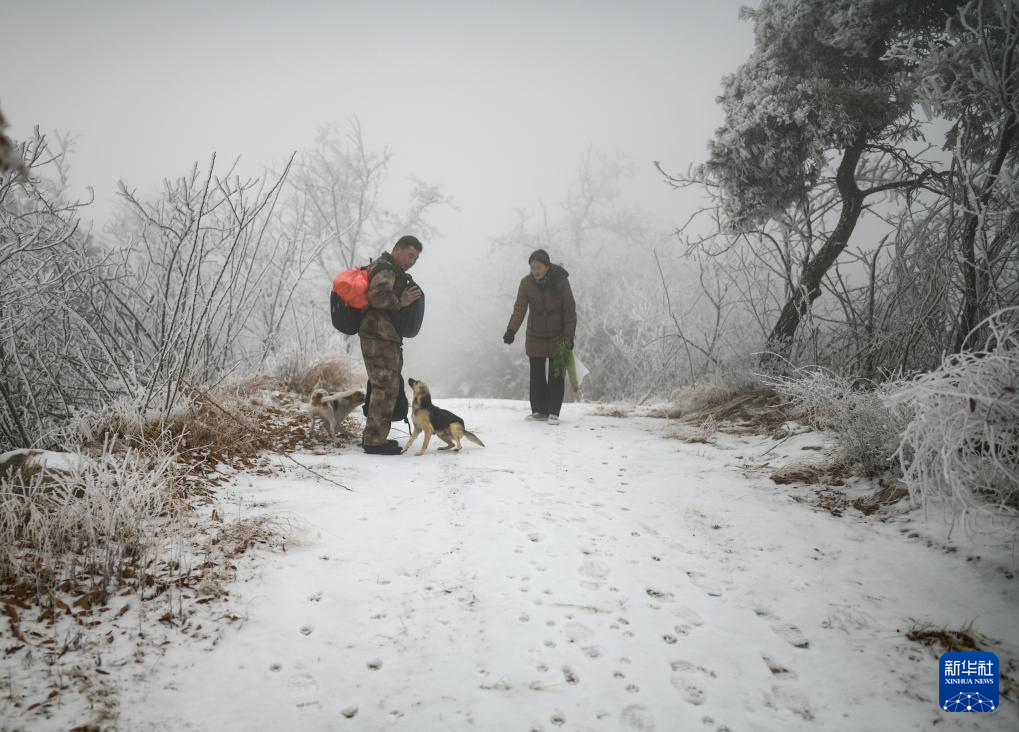 1月18日,在山东省潍坊市临朐县国有沂山林场,护林员蔡长春(左)和妻子张庆丽还没到瞭望哨,两条狗已经跑来迎接他们。