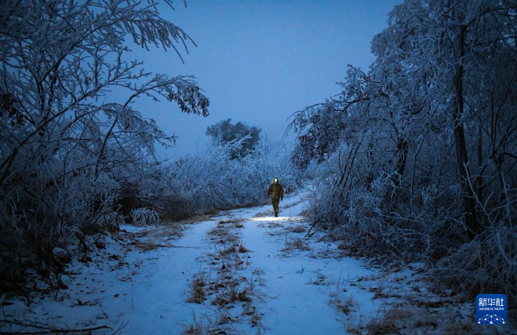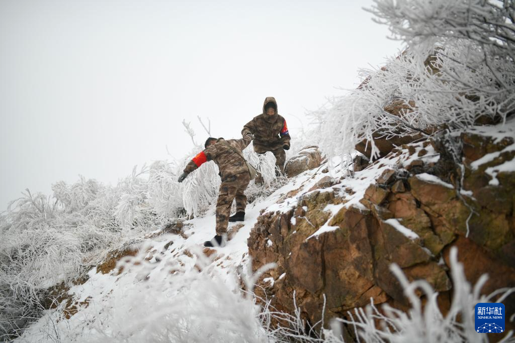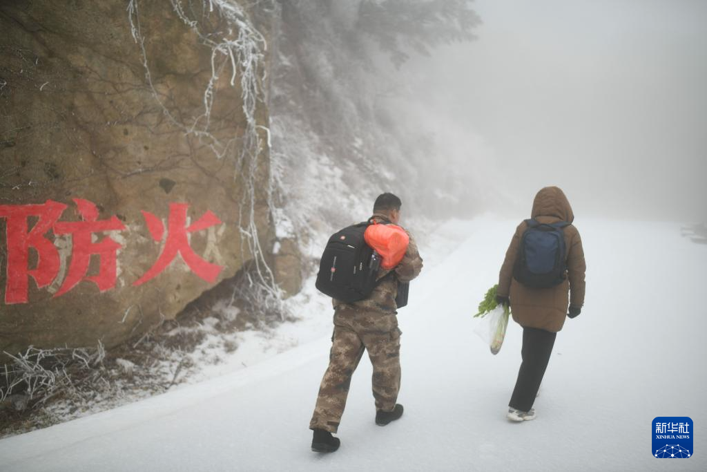 1月18日,在山东省潍坊市临朐县国有沂山林场,护林员蔡长春(左)和妻子张庆丽徒步上山。
