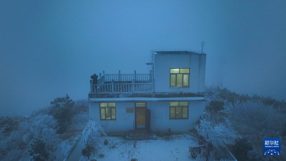 1月18日,在山东省潍坊市临朐县国有沂山林场,护林员蔡长春站在金山顶瞭望哨向外瞭望(无人机照片)。