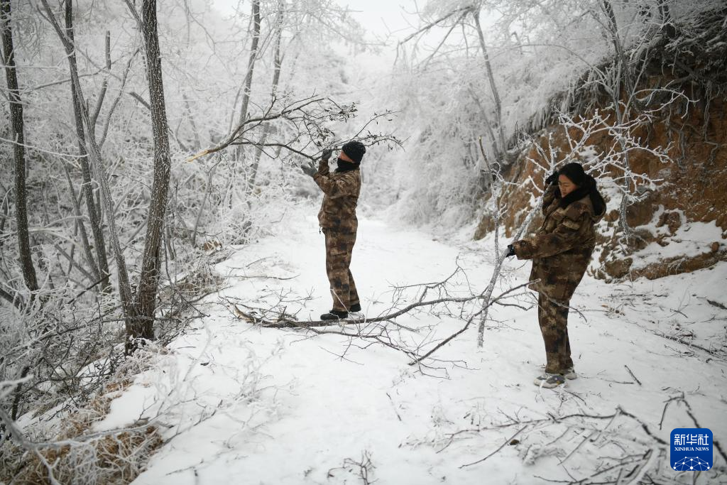 1月20日,在山东省潍坊市临朐县国有沂山林场,护林员蔡长春和妻子张庆丽清理被冰雪压折的树枝。