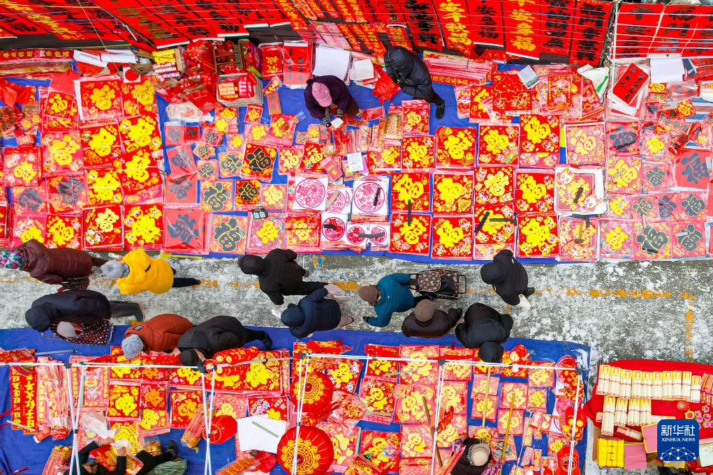 1月22日,人们在山东省青岛市李村大集选购春节饰品(无人机照片)。