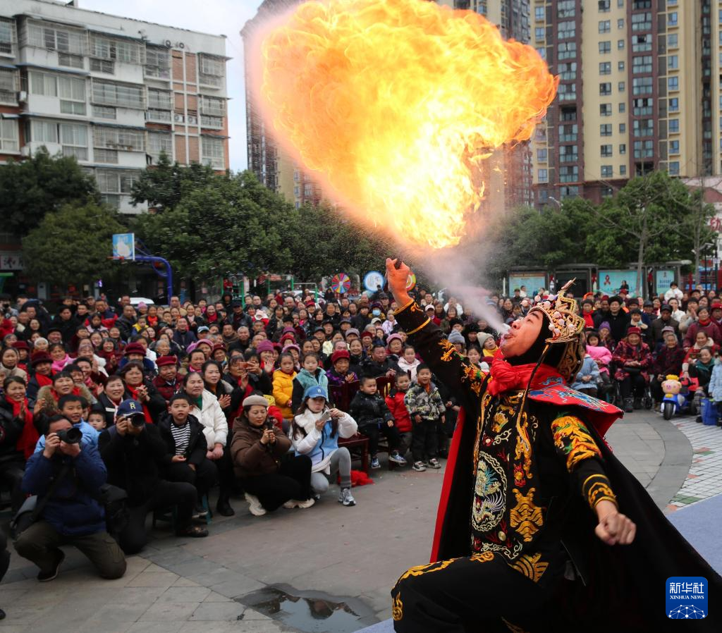 1月22日,演员在四川省眉山市东坡区尚义镇七里社区表演川剧绝活吐火。