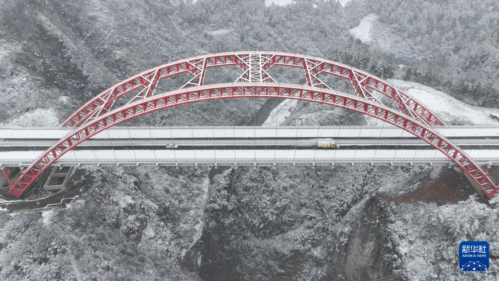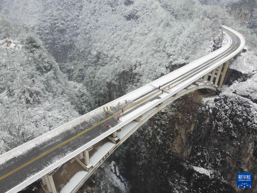 1月22日,青年志愿者在贵州省黔东南苗族侗族自治州施秉县江凯河大桥开展除雪作业(无人机照片)。