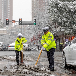 1月23日,在浙江省温岭市,人们在清除路面冰雪。