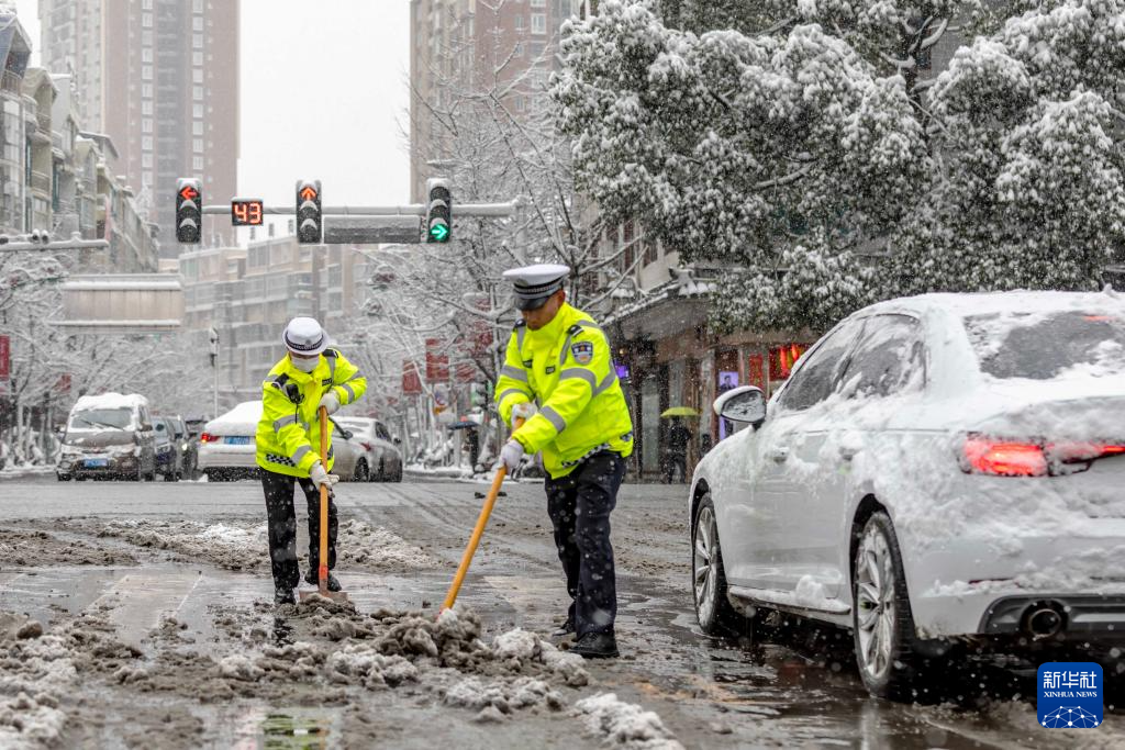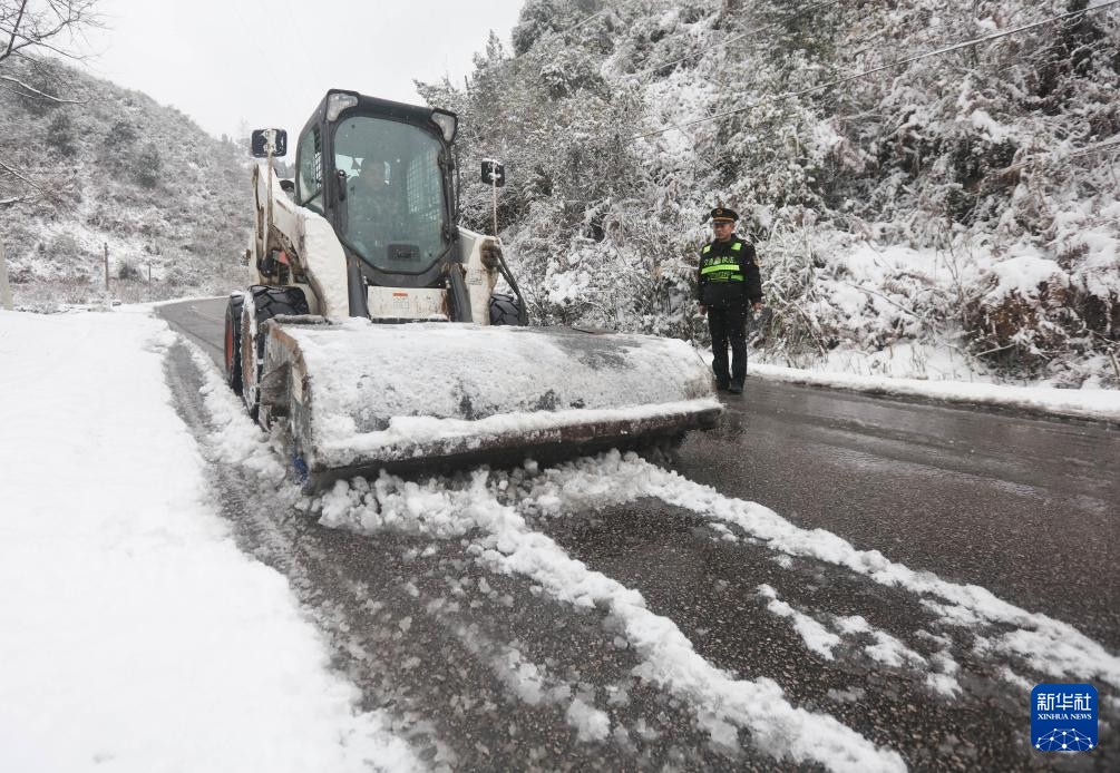 1月22日,交警在贵州省黔西市清理道路积雪。