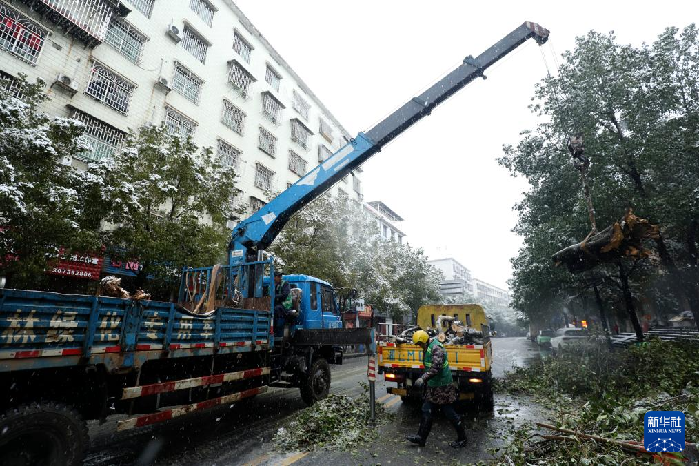 1月22日,在湖南省资兴市,园林工人在清理被积雪压倒的树木。