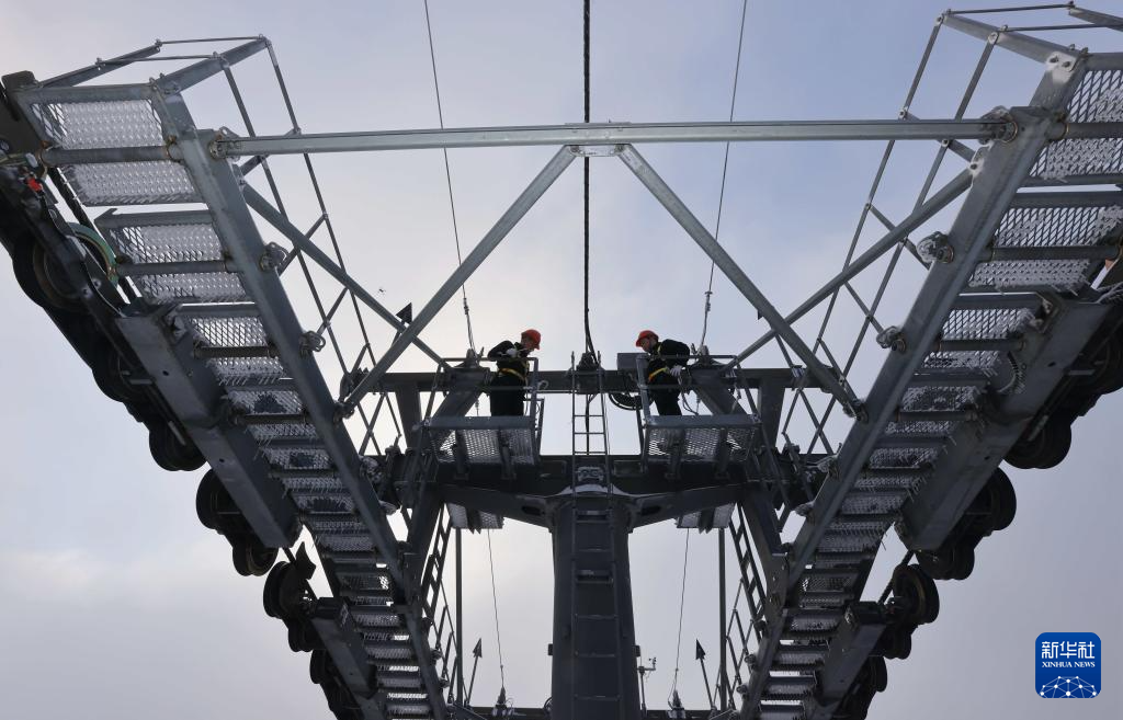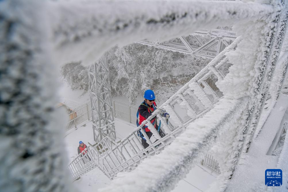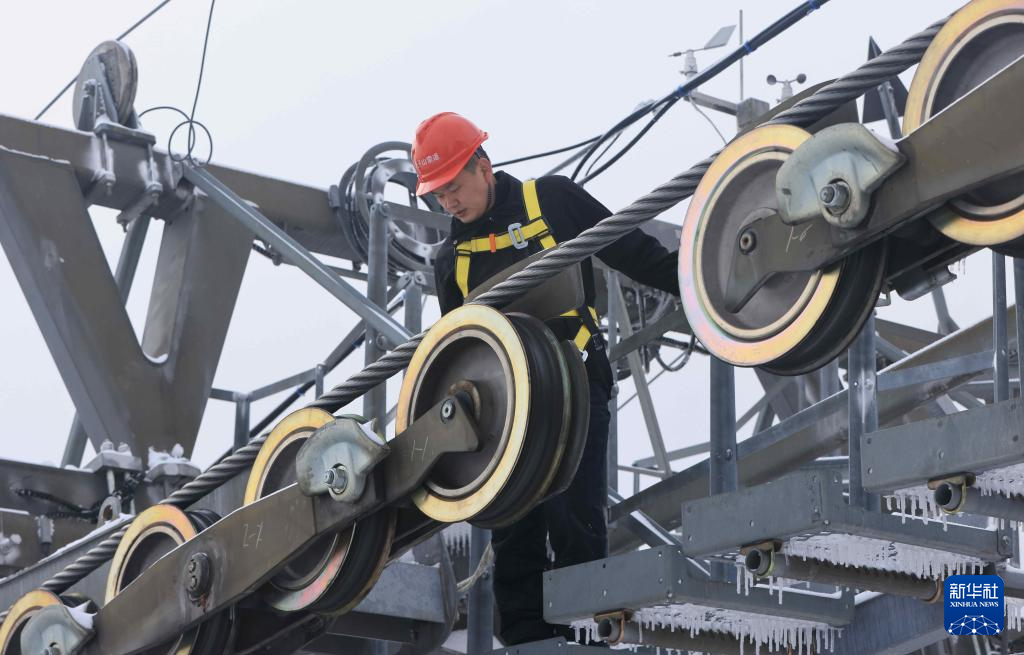 1月23日,湖南张家界国家森林公园天子山索道检修工人在索道支架上巡检设备,清理冰雪。