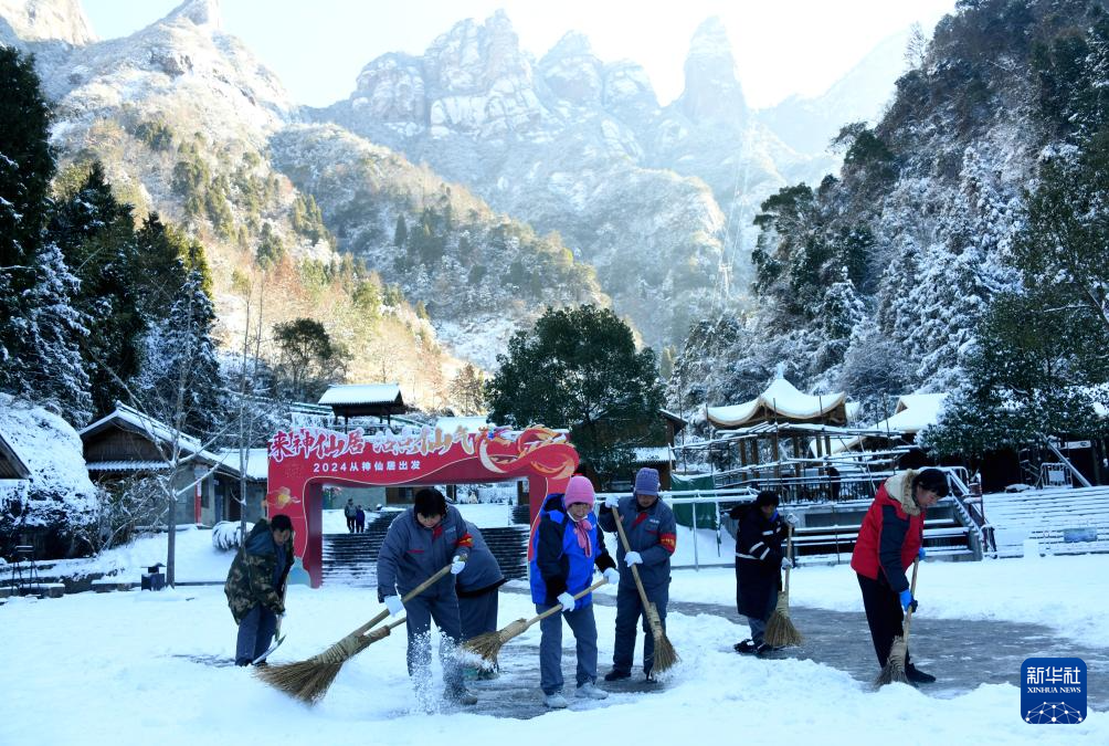 1月23日,浙江省台州市仙居县神仙居景区工作人员在清除旅游通道冰雪。