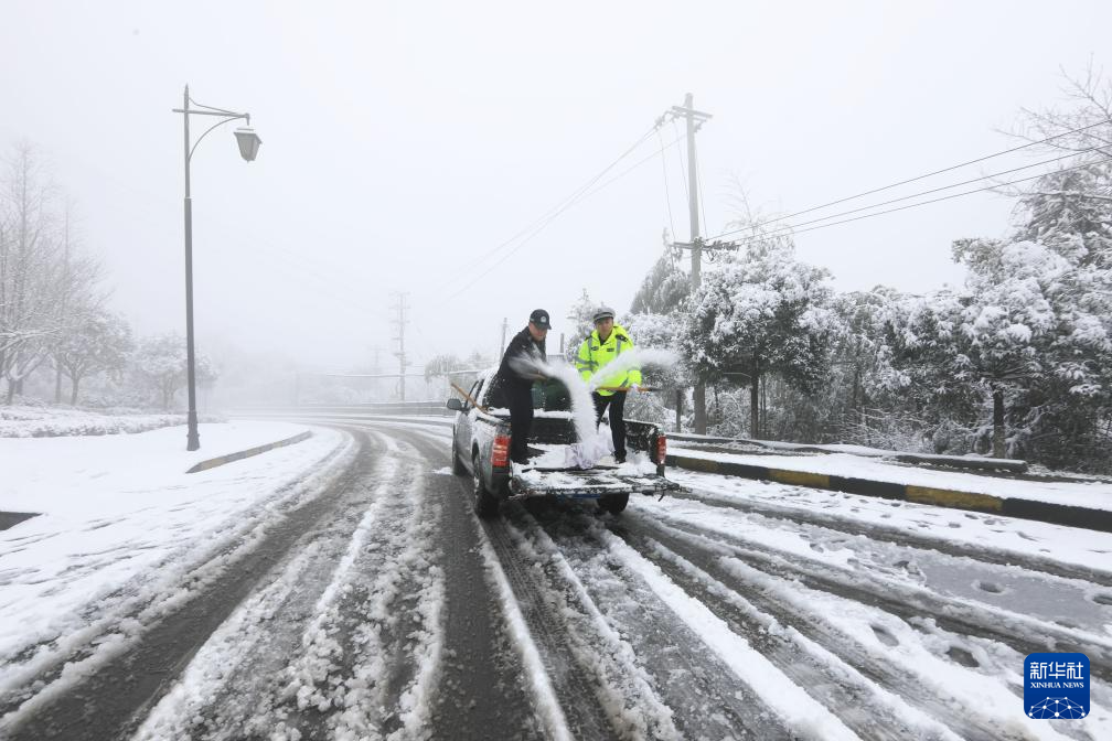 1月22日,贵州省黔东南苗族侗族自治州施秉县公路管护人员在进行路面除冰雪作业。