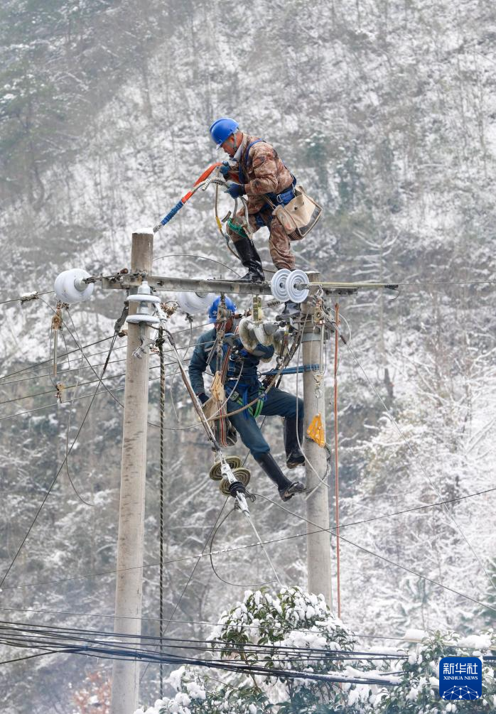 1月23日,在贵州省黔东南苗族侗族自治州岑巩县思旸镇新安村,工作人员对电力线路进行抢修。
