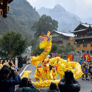 1月24日,宣恩县长潭河侗族乡两溪河村的村民在寨前舞龙。