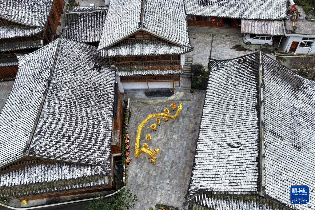 1月24日,在宣恩县长潭河侗族乡两溪河村卢家院子,村民在表演舞龙(无人机照片)。