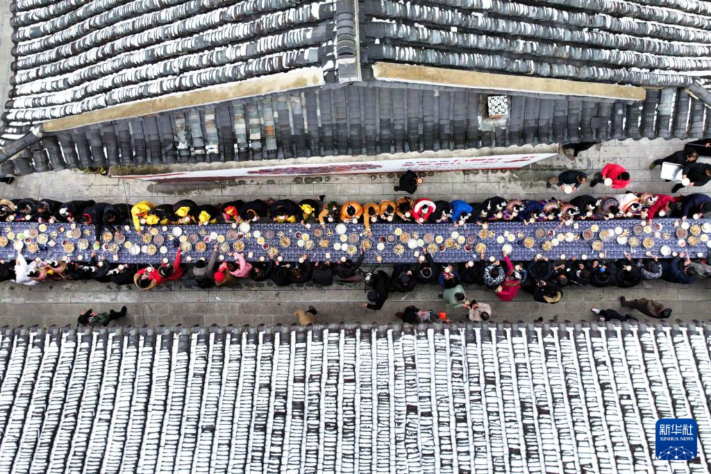 1月24日,在宣恩县长潭河侗族乡两溪河村卢家院子,村民聚在一起吃“合拢宴”(无人机照片)。