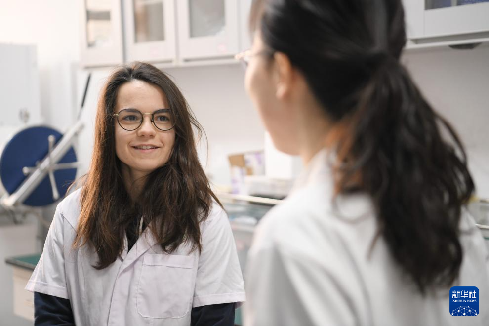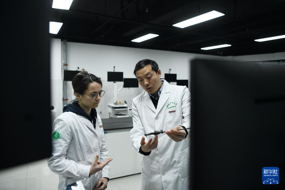 1月23日,在安徽医科大学临床药理研究所,一名教师向章伯涵(左)介绍炎症免疫性疾病的相关知识。