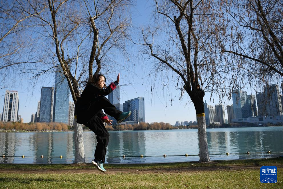 1月23日,章伯涵在安徽省合肥市天鹅湖畔练习太极拳。