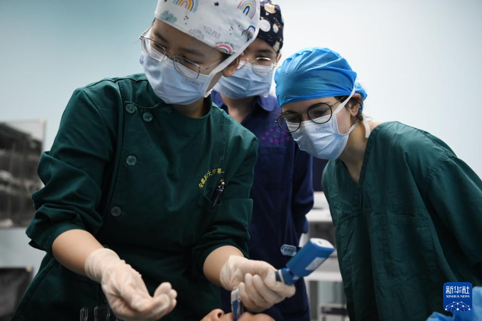 1月23日,章伯涵(右)在位于安徽省合肥市的安医大第一附属医院学习临床知识。