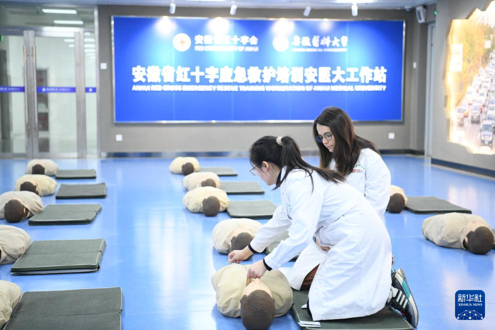 1月23日,章伯涵(后)在安徽医科大学学习心肺复苏术。