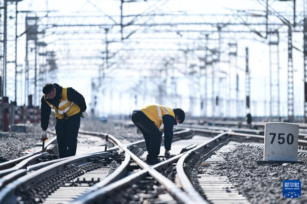 1月29日,格尔木电务段格尔木东信号车间察尔汗信号工区职工杨正宏(左)和胡进海在对察尔汗站道岔进行检修作业。
