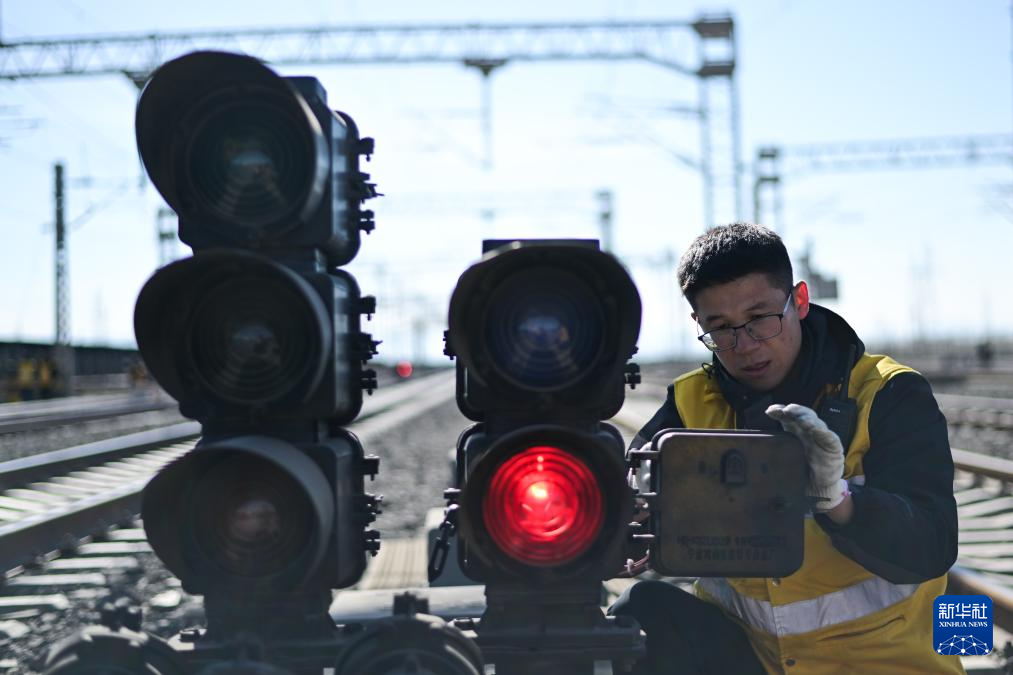 1月29日,格尔木电务段格尔木东信号车间察尔汗信号工区副工长张世铎在检修信号机。