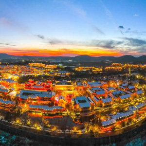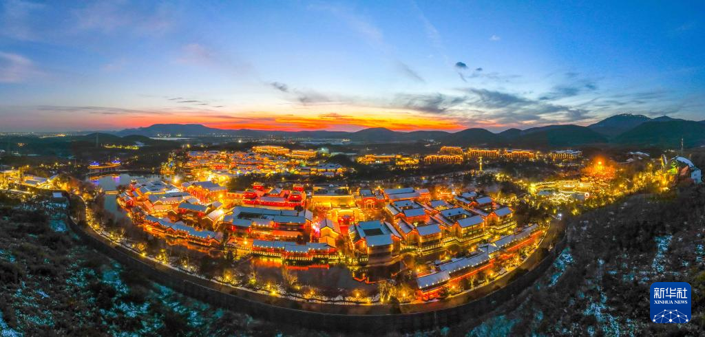 茅山脚下的常州金坛东方盐湖城夜色(2023年12月22日摄,无人机照片)。