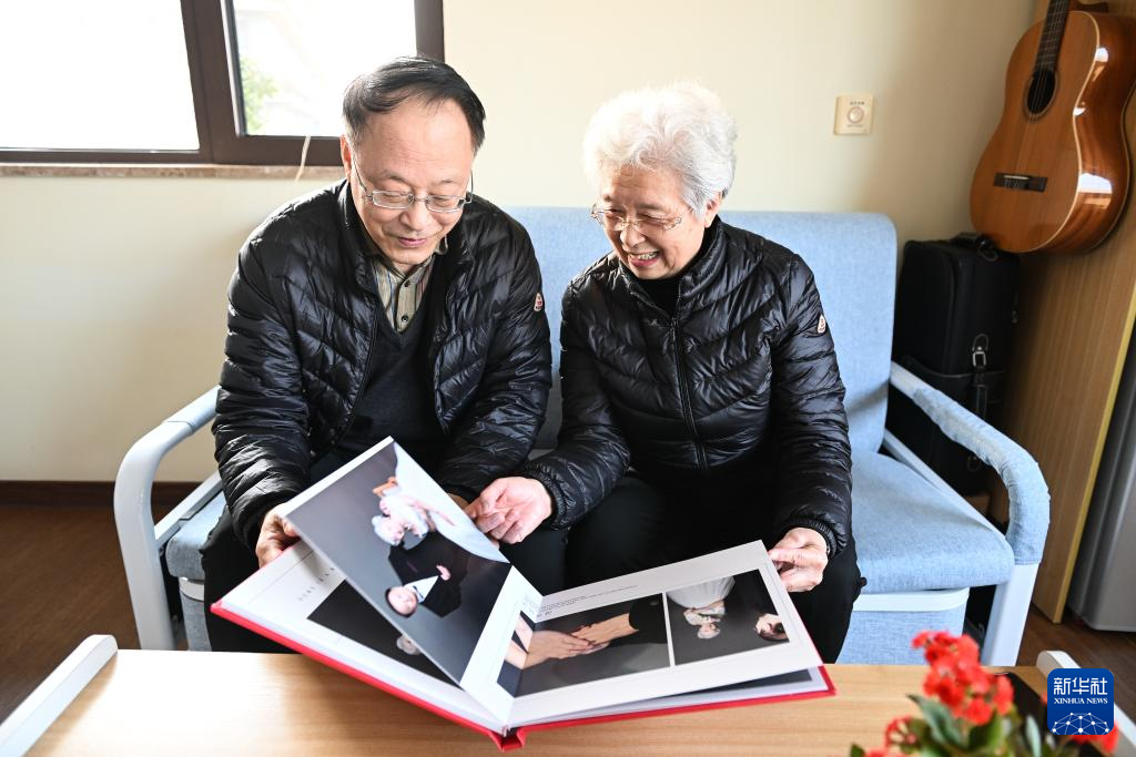 在常州安信颐和颐养公寓,78岁的王希志和77岁的老伴王洁芳翻看养老机构给他们拍摄的婚纱照(1月9日摄)。