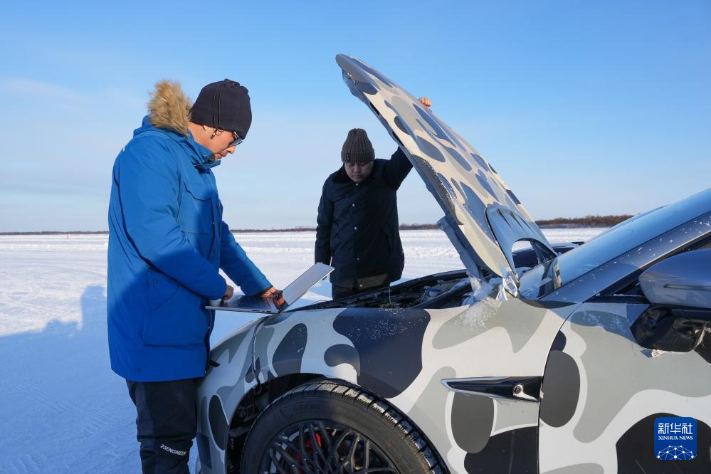 1月31日,在黑河小乌斯力测试基地,工程师姚冬(左)查看经过寒区测试后的车辆情况。