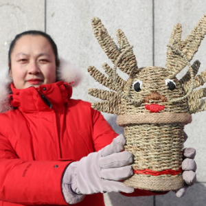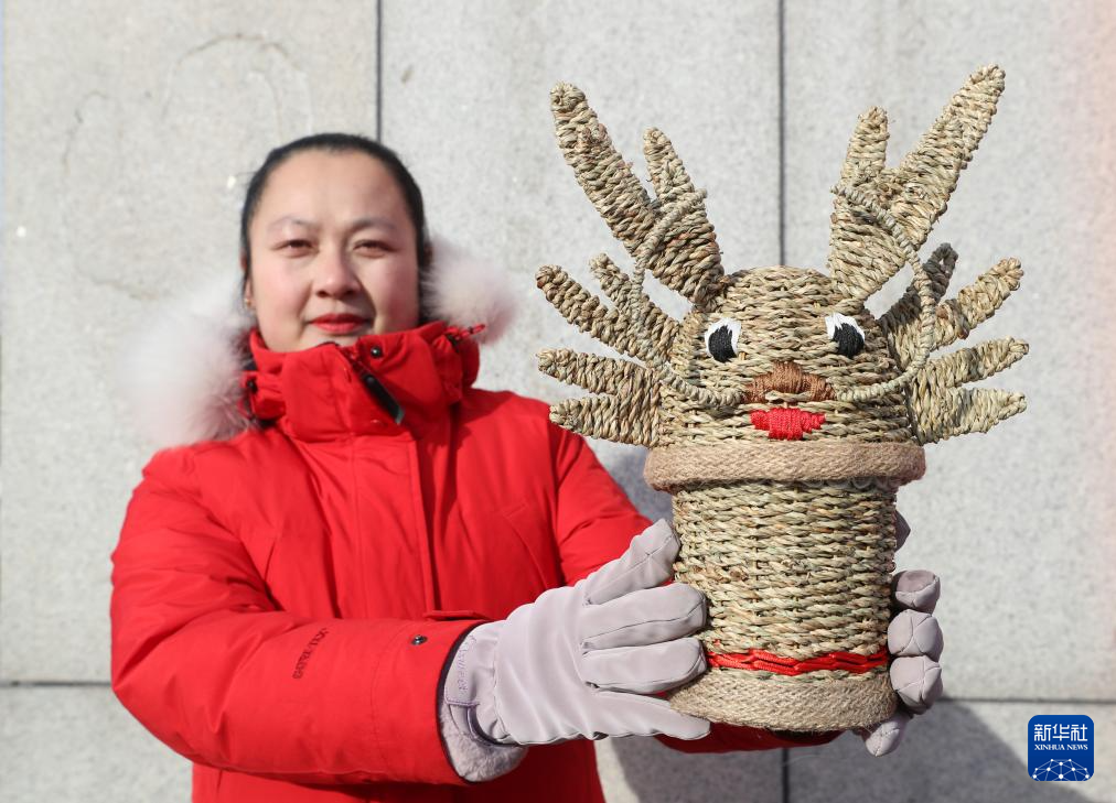 2月1日,在盘锦小亮沟苇艺草编专业合作社,农民展示编织的芦苇工艺品。