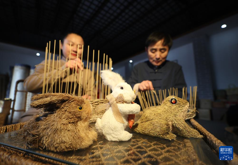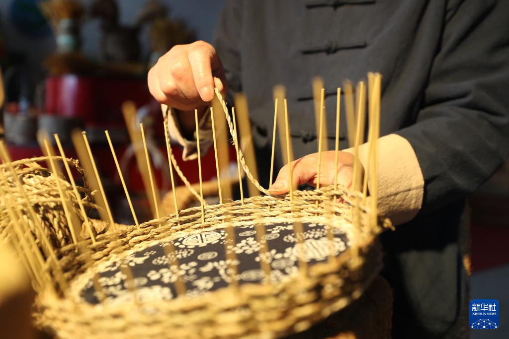 2月1日,在盘锦小亮沟苇艺草编专业合作社,农民编织芦苇工艺品。
