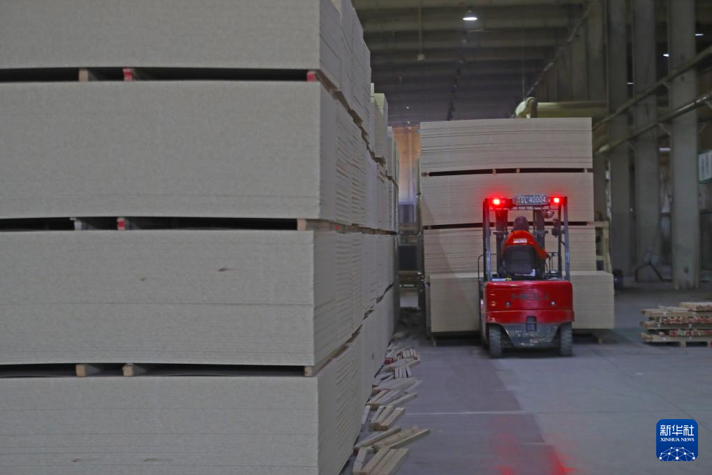 2月1日,在盘锦积葭生态板业有限公司,工作人员操控铲车运输芦苇制作的板材。