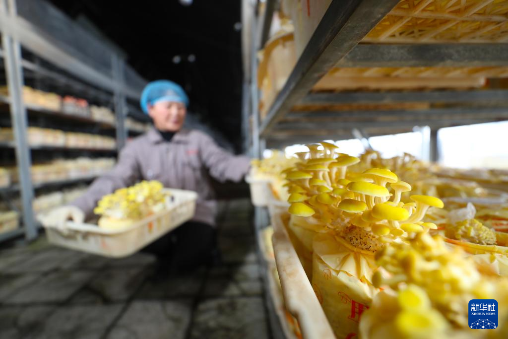 2月1日,在盘锦嘉润禾食用菌种植专业合作社,农民在大棚里采摘由芦苇作为菌棒原料培养的蘑菇。