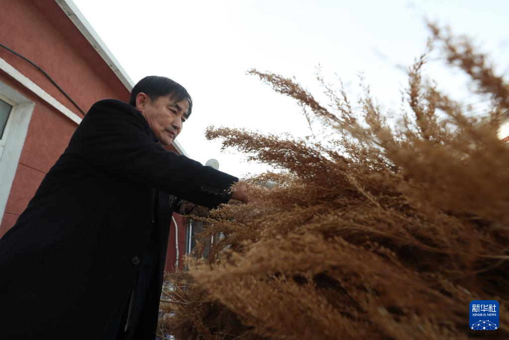 2月1日,在盘锦小亮沟苇艺草编专业合作社,农民整理堆放的芦苇。
