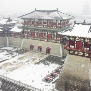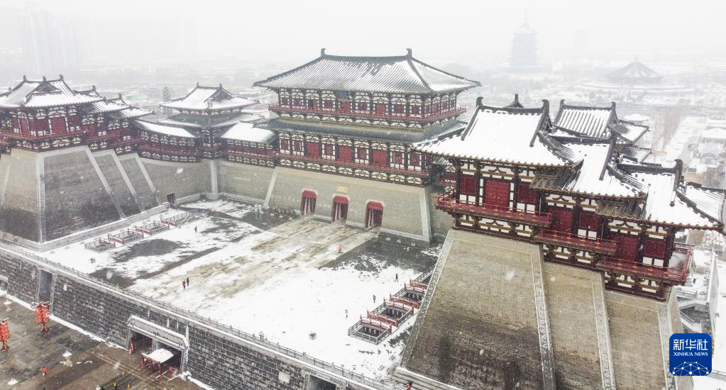 2月3日拍摄的河南洛阳市隋唐洛阳城国家遗址公园应天门景区雪景(无人机照片)。
