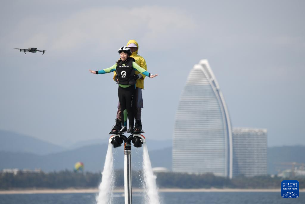 2月4日,在海南省三亚市蜈支洲岛旅游区,游客体验动感飞人项目。